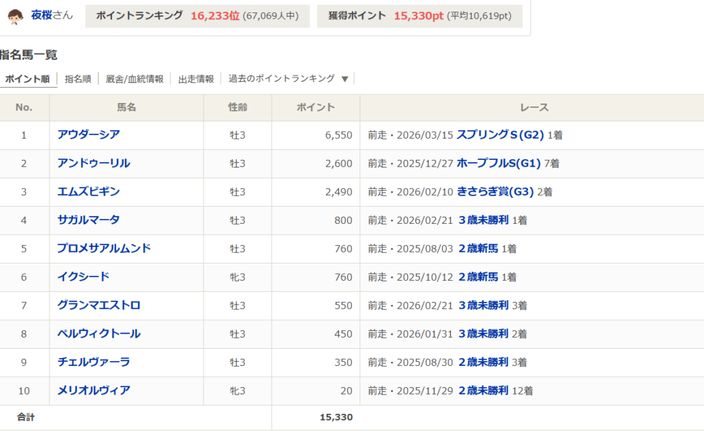 私は馬を見る目に関しては平均より上にいる自信がある。直近だとスプリングSのパドック評で上位評価した3頭が1〜3着を占めたし、POG誌で馬体を見て未来の重賞馬を指名した経験も複数ある。この手の話は枚挙にいとまがない。それだけ自信がある。