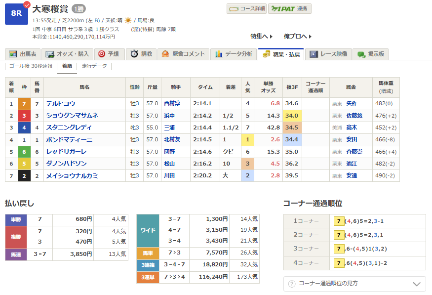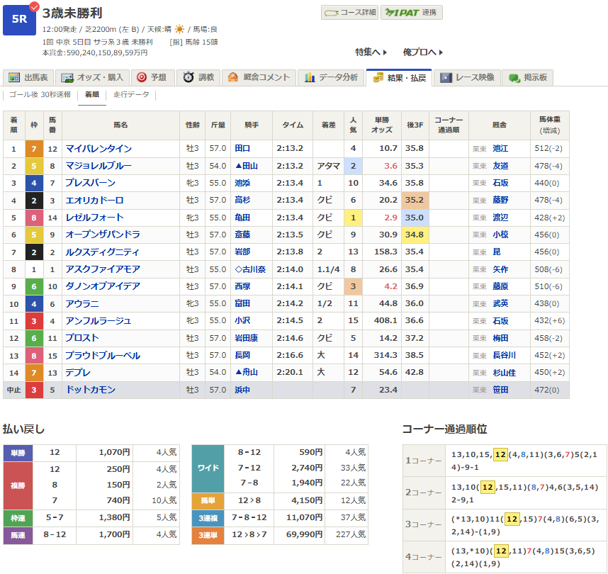 このレースは7頭立てで、複勝は2着までしかつかない。でも、ワイドなら3着でも拾える。相対的にワイドが優秀になるケースなのだ。結果は以下の通り。