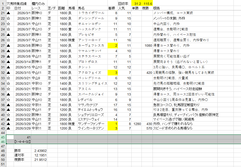 2月からスタートした穴馬特集だが、現在2~3月までに41頭推奨して、1勝、2着4回、3着4回で、勝率は2.44%と低いが、複勝率は21.95%となっている。
