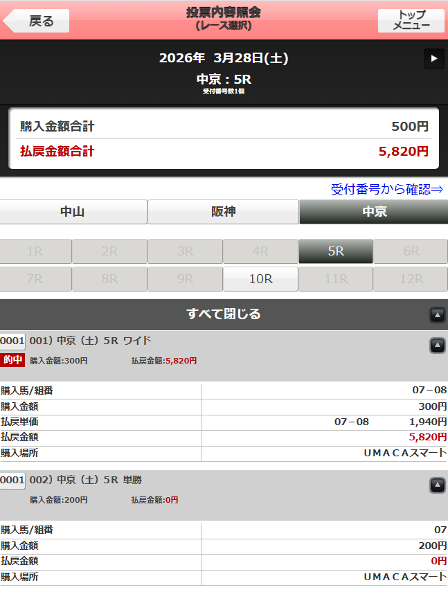 この通り、スタニングレディは3着だったので複勝はつかない。しかし、ワイドだから取れた。これも単ワイのメリットと言えるだろう。