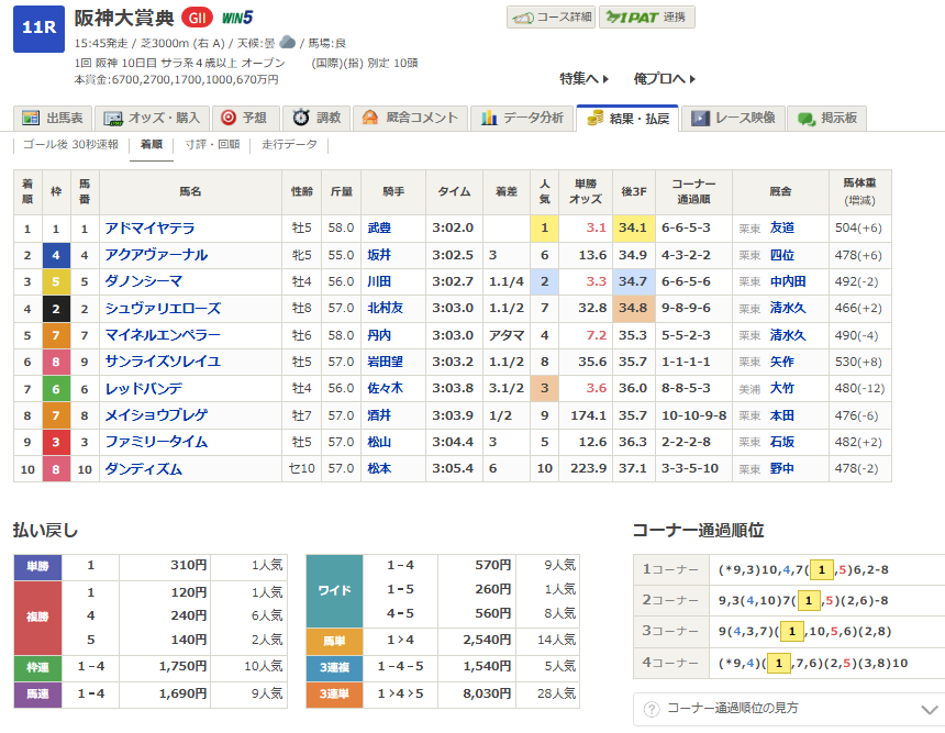 ほか、三連複と三連単を買ったのは、残り1枠がほぼほぼアドマイヤテラと思っていたから。三連系を1点でとれる可能性があるとなれば、やはり買う。結果的に1、3、4着の目になってしまったが、悔いはない。そもそもアクアヴァーナルはそこまで高く評価していなかったので、その評価が誤りだっただけだ。