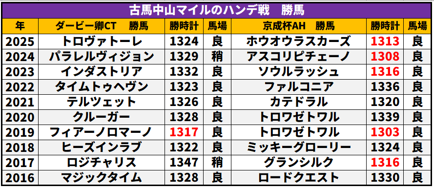 赤字にしたのはいずれも1分32秒を切ったレースだが、見るからに京成杯AHの勝時計が速い。先述の通り、京成杯AHは9月の開催で、とにかく速い時計が出やすい状況となる。このコースで芝が良好、さらに言えば斤量が軽くなりやすい3歳馬も多く出走する点からスピードの速い決着になりやすいのだ。