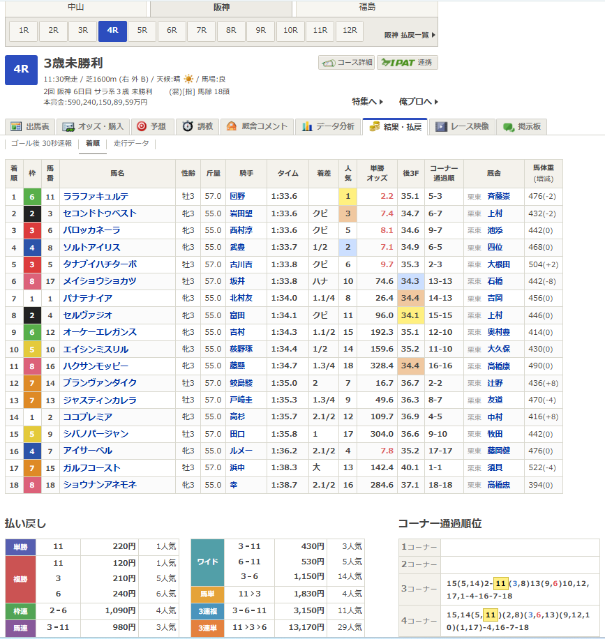次点はセコンドトゥベスト。こちらも赤オッズだったと覚えているので、このレースは堅いんじゃない? というのが阪神4R全体の最終的な見立てだった。