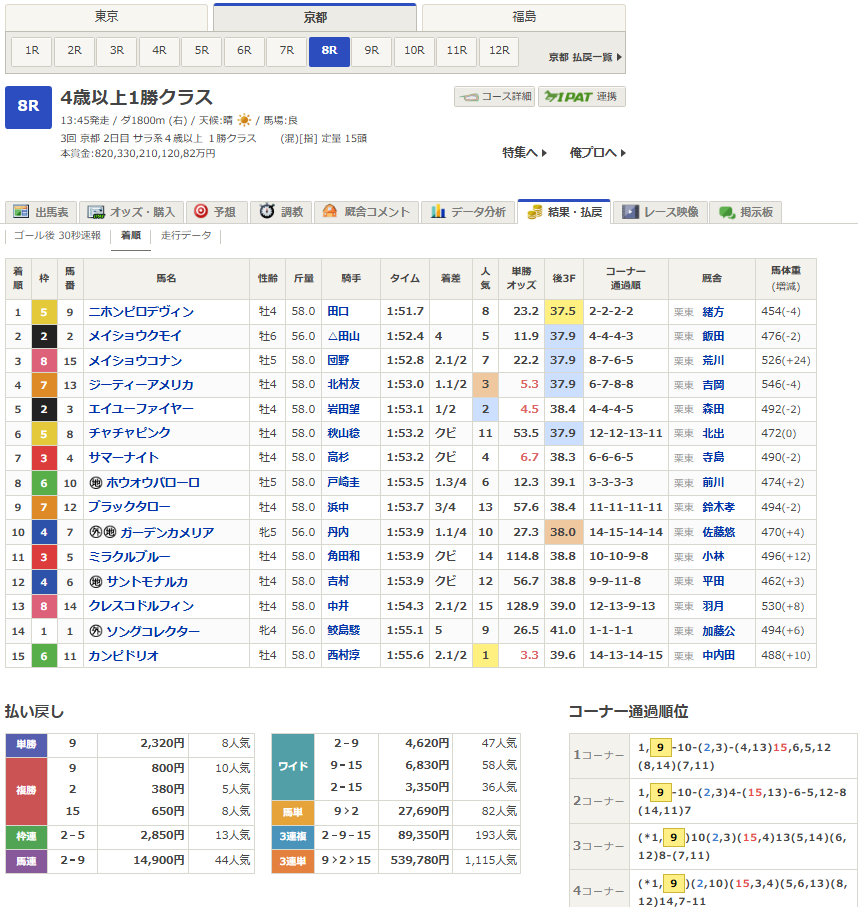 このように、ニホンピロデヴィンの複勝オッズは「6.0 – 8.8」だったが、はほかの買い目の人気がなかったため、800円に上振れる。